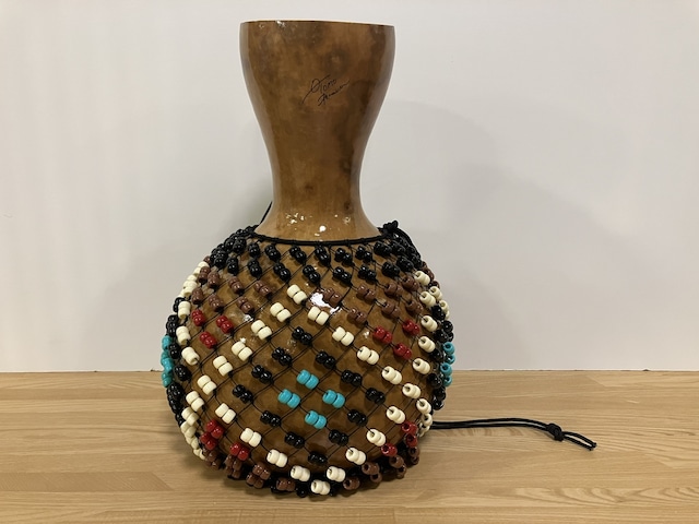 「旅のお供に音楽を」というコンセプトを元に立ち上げた日本製のシェケレ専門ブランド「OTOMO Percussion」のシェケレは全て天然のひょうたんを使用しており、ひとつひとつ丁寧にハンドメイドで仕上げています。 シェケレは少し重い印象をお持ちの方もいらっしゃるかもしれませんが、気軽に外に持ち出していただけるよう、小ぶりなサイズや軽量化を意識して製作しております。 本モデルは、海と大地が出会う風景をイメージして製作しました。 温かみのあるひょうたんの色合いは大地を、深いブルーと生成りのビーズ、そしてタカラガイは海の気配を表現しています。 ◾️貝殻(タカラガイ)の耐久性について 本モデルに使用している貝殻(タカラガイ)は、西アフリカにおける伝統的なシェケレの仕様として古くから用いられてきた素材であり、本来のシェケレに近い構成となっております。タカラガイは、かつて通貨として流通していた歴史もあり、日常的な使用に耐える強度を持つ素材として扱われてきました。 割れやカケなどについては他のビーズ素材と同様のため、通常の演奏用途において特別に気をつける点はなく、貝殻ならではの硬質で迫力のあるアタック感や、独特の質感を含め、伝統的な質感を楽しんでいただける仕様となっております。 【おすすめポイント】 ・適度な軽さと心地よい低音を両立した、特別なひょうたんを使用 ・プラビーズと比較して、ザクっとした芯のある太い刻みが響きます ・体格が小柄な方にもフィットします ・演奏しないときにもインテリアとして楽しめる美しいデザイン 【仕様】 [素材] 海外産品種 日本産のひょうたん [サイズ] ●横幅 約21cm ●高さ 約26.5cm ●重さ 約378g ●胴回り(一番太い部分)約 74cm ※注意 天然ひょうたんを用いているため、自然な傷や模様があります。ご留意下さい。