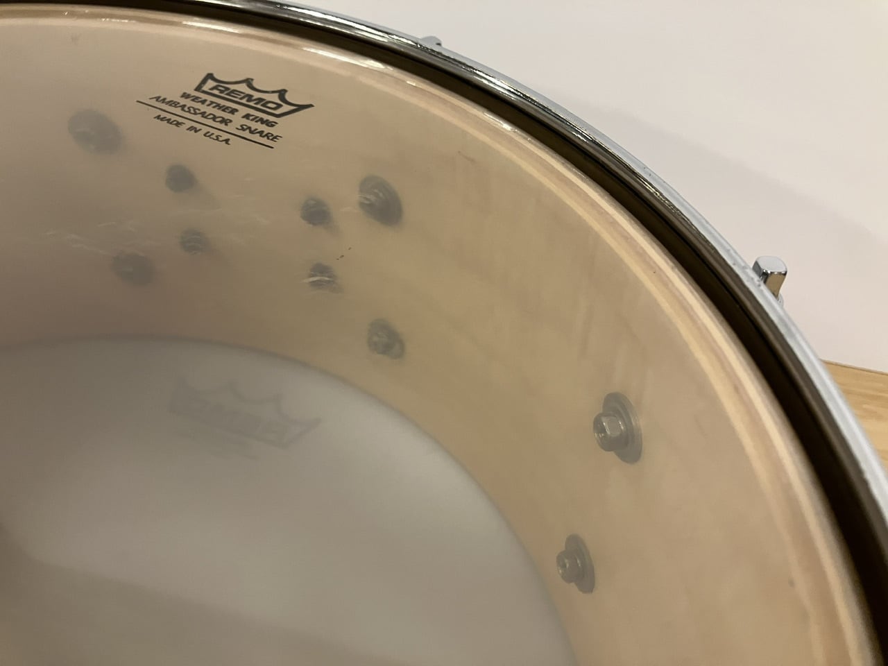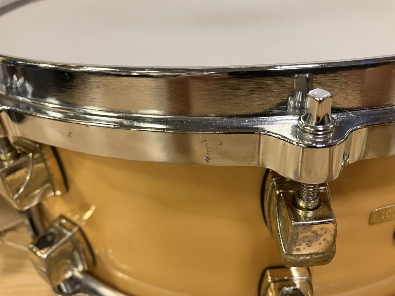 現状、ラグに大きな変形など無く、ご使用に問題無い、健康な状態ですが、この時期のメイプルカスタムはハイテンションでの使用に向いておらず、ヘッドに過度なハイテンションを掛けるとラグが破損する恐れがございます。