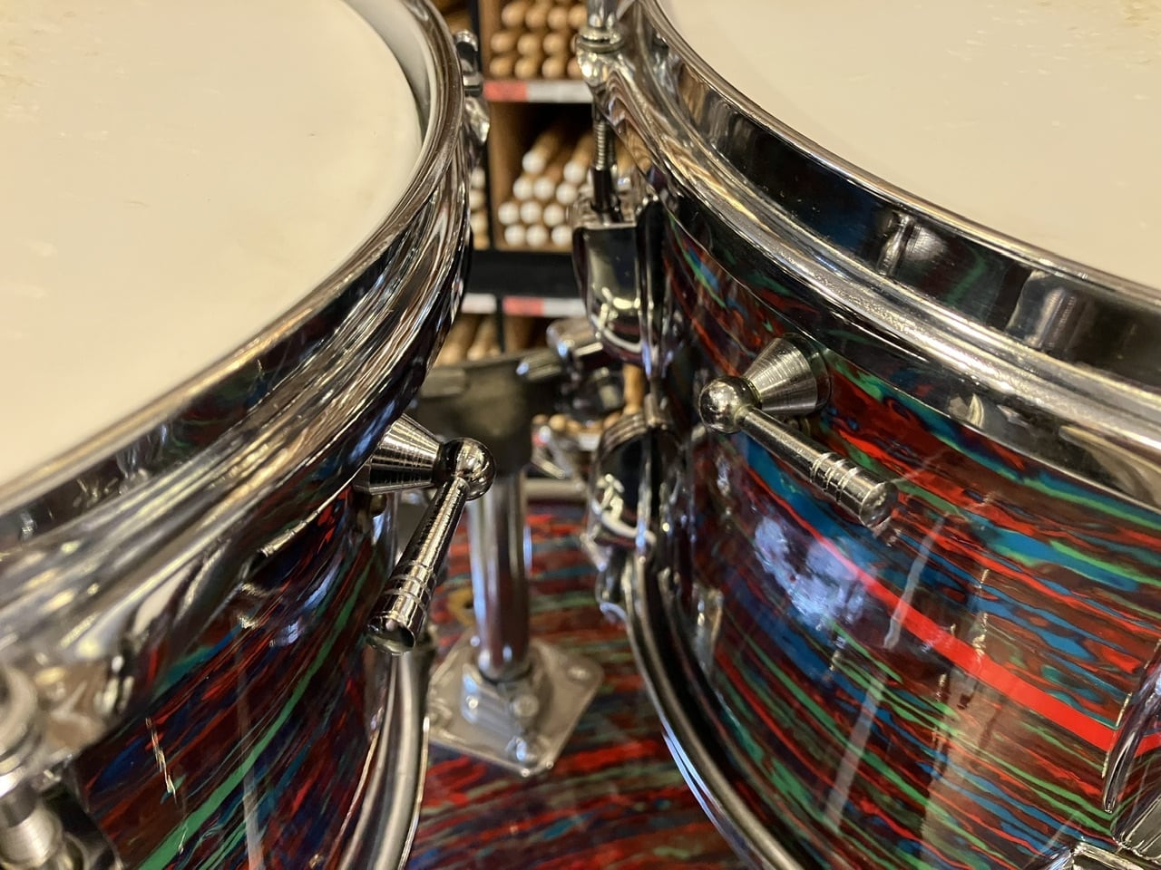 時代を感じるパーツのデザイン、タムとフロアについたベースボールバット式の内蔵ミュートなど、随所のパーツからもヴィンテージのテイストを感じさせてくれます。