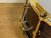 ダークなトーンとはっきりした発音、ヌケの良いサウンドが特長のBirch材と硬質で重厚感のあるWenge材のハイブリッドシェルを、11ply-9mm厚で成型し、Crackを際立たせるベアリングエッジを施しました。彼のリクエストである、「Power Fusion Rock, Jazz,Funkに幅広く適応できる事」「”LOUD”, “SNAP” & “CRACK”を満たす重厚なサウンドとリッチな外観」を高次元で実現したスネアドラムです。