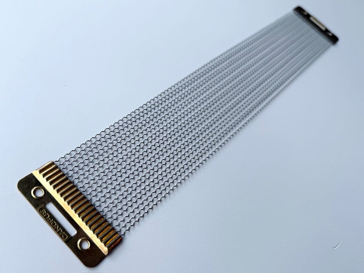 カノウプス・ヴィンテージ・スネア・ワイヤーは、ヴィンテージ・スリンガーランドのスネア・ワイヤーを正確に成分分析し、同一素材を採用。量産が非常に難しい線径0.5mm、線外径1.35mm、ピッチ3.4mmのオリジナル形状を忠実に再現しました。