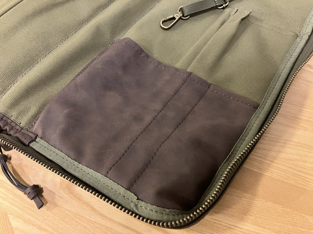 スティックやマレット、ブラシを整理して収納可能な仕切り付のメインポケットの他、短めや小型のアクセサリを収納可能なレザー調の浅いポケットを装備しています。