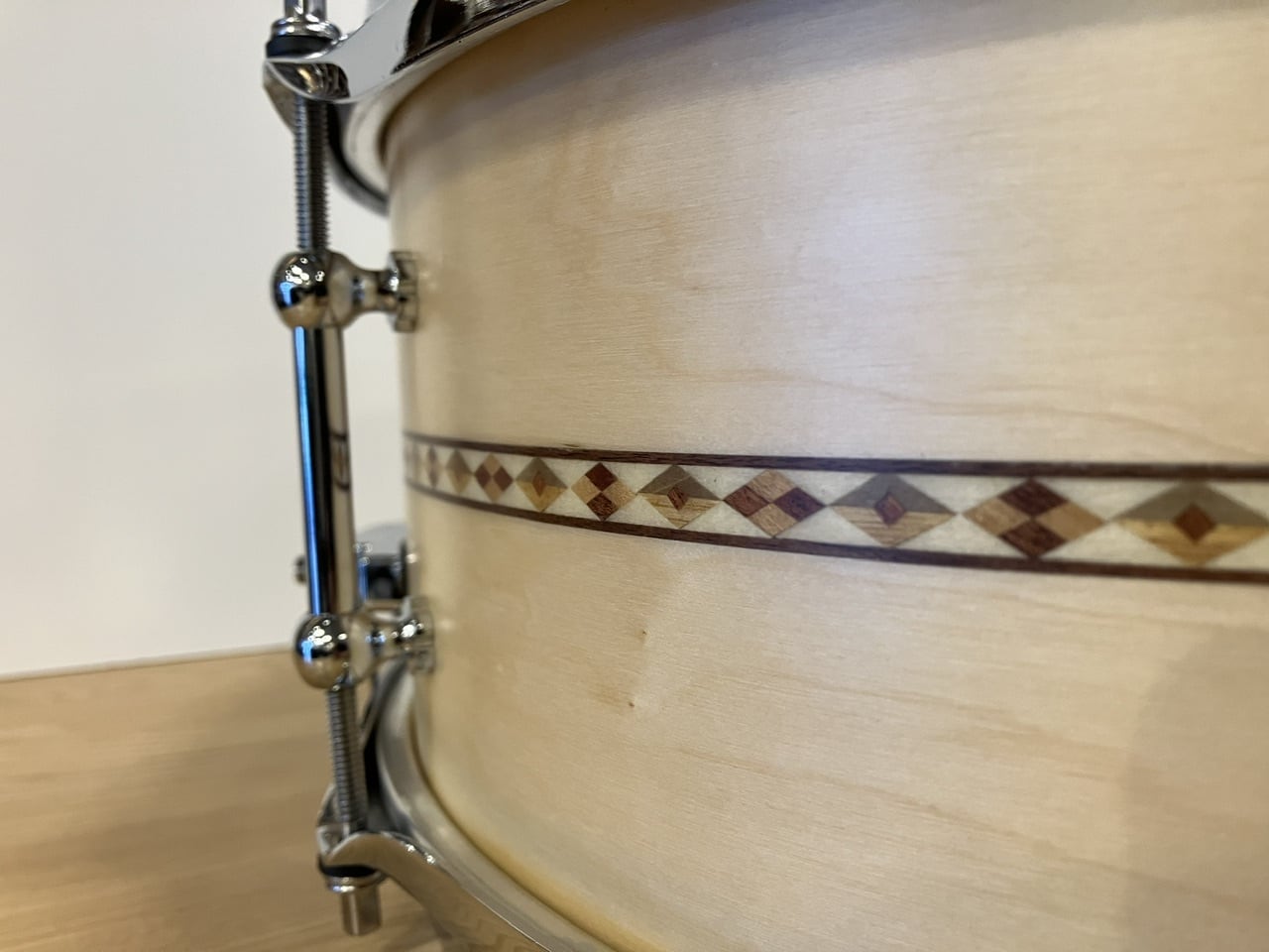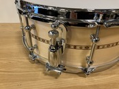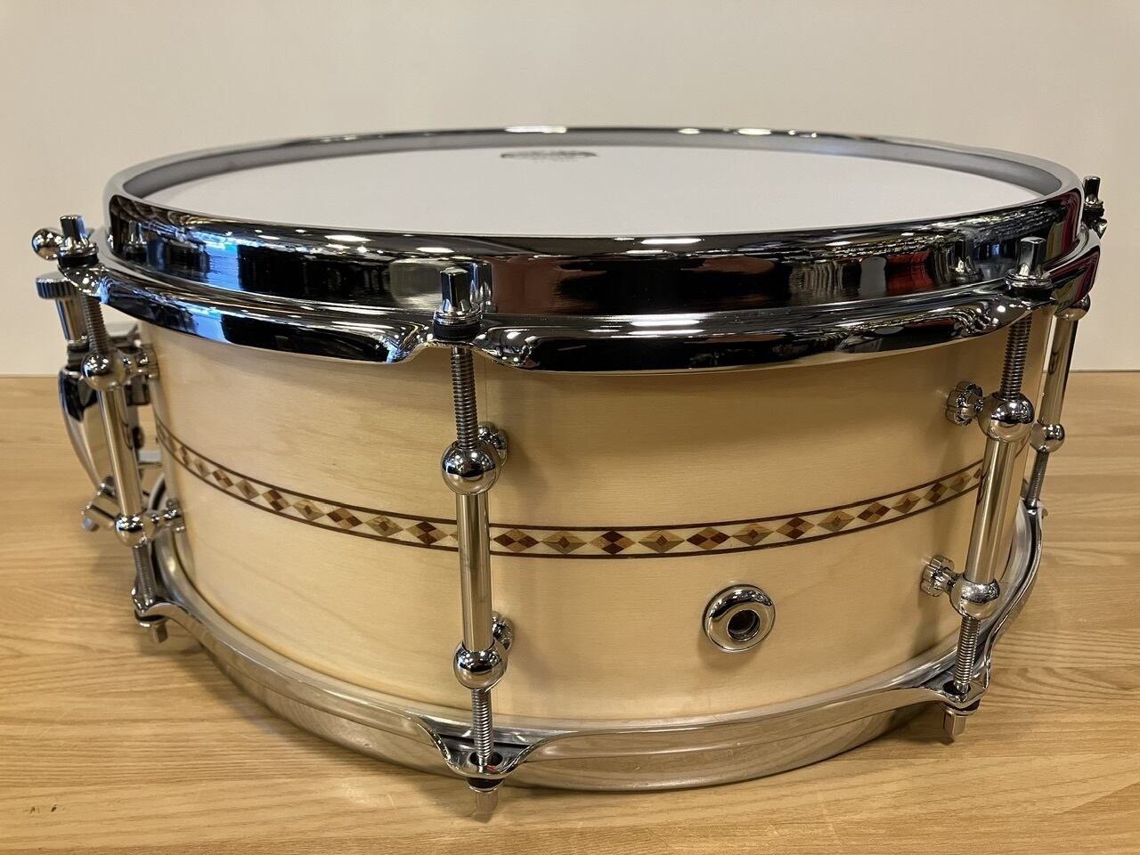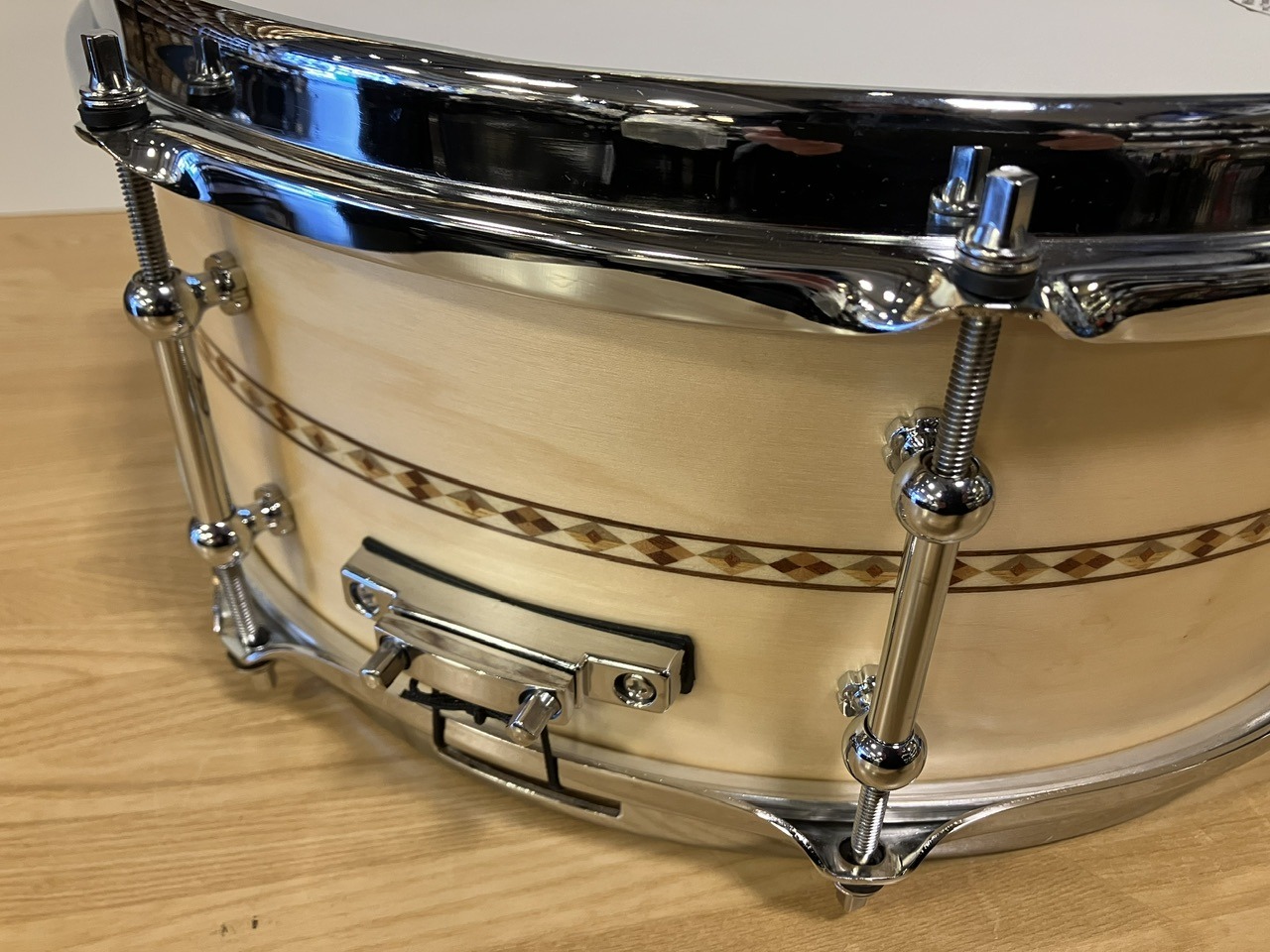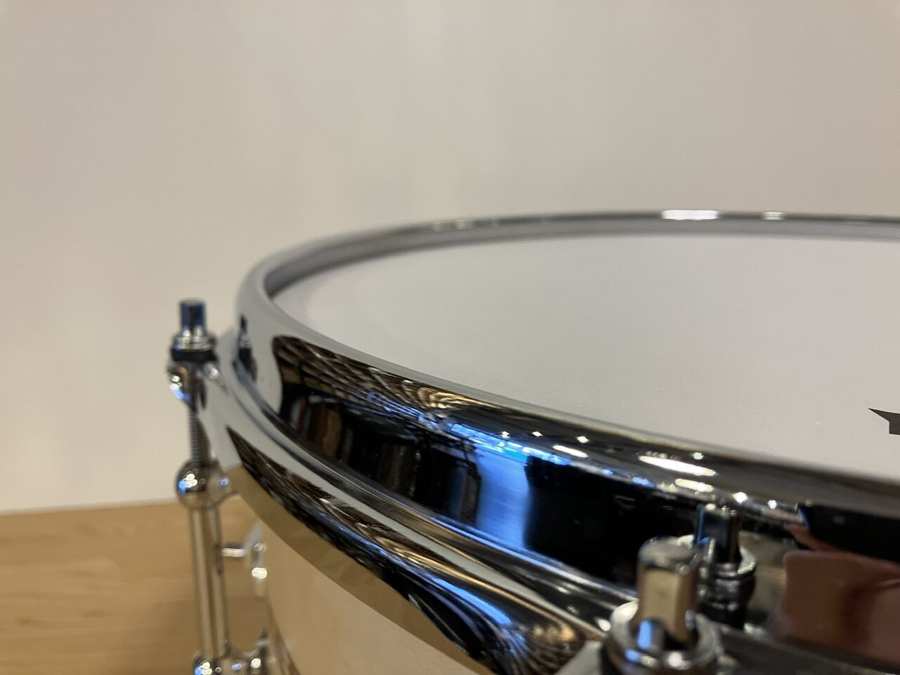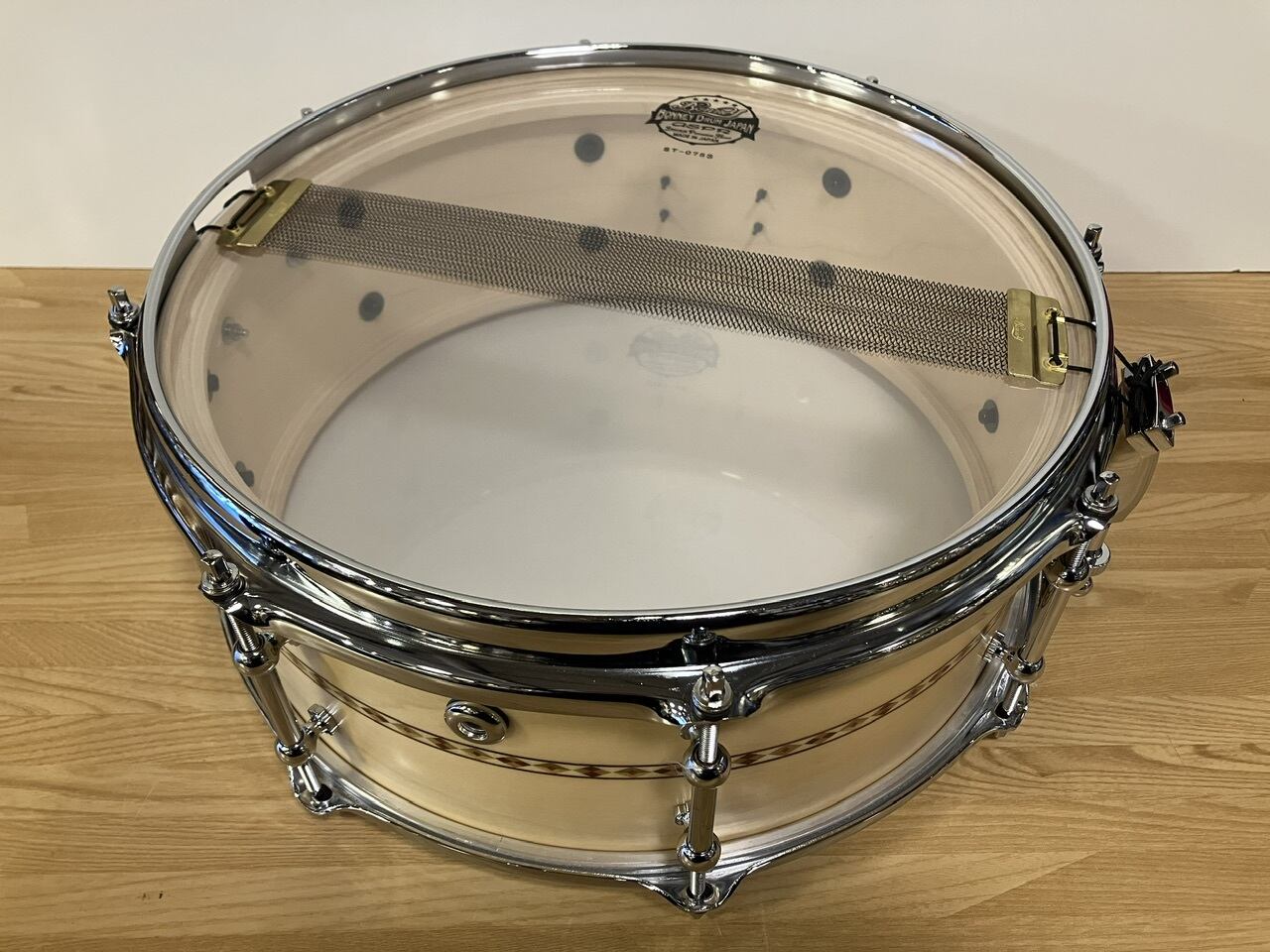少しラウンド気味のエッジから生まれるマイルドな打感のタッチが印象的で、全体的にアコースティック感の強いマイルドなサウンドですが、内巻きのフープから生まれる纏まりの良いトーン、レスポンスも良いスネアワイヤーのタッチとバランスに優れた楽器に仕上がっており、幅広い音楽に対応できるポテンシャルを持ったス一台です。