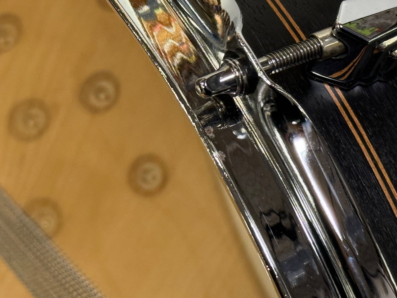 ラグの内側に取り付けられたプラスチック製の固定具はフェルールナットをしっかりと固定するためにあえて小さめのサイズとしており、テンションロッドがしっかりとこのプラスチック固定具にアタッチされタイトなグリップを実現しています。