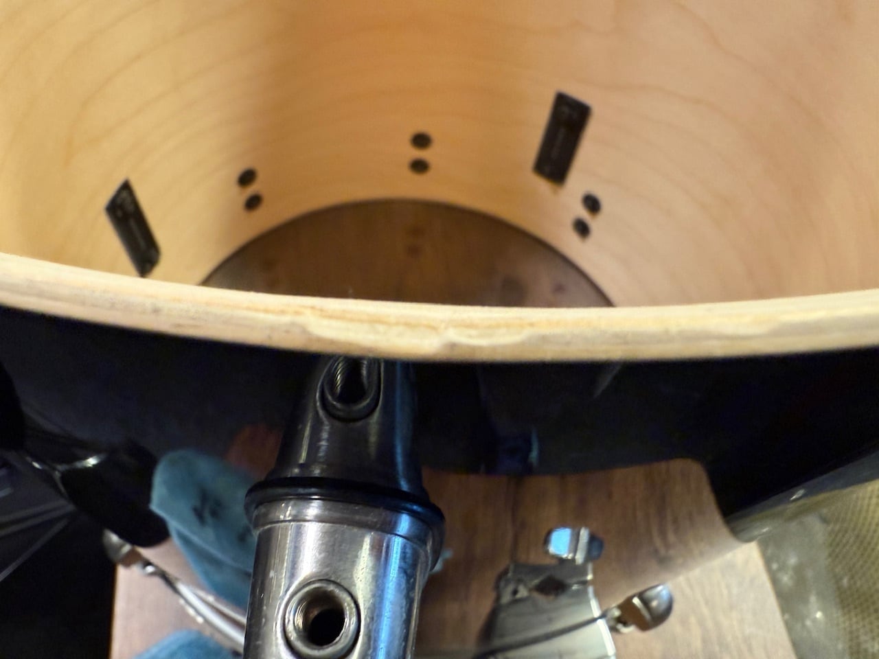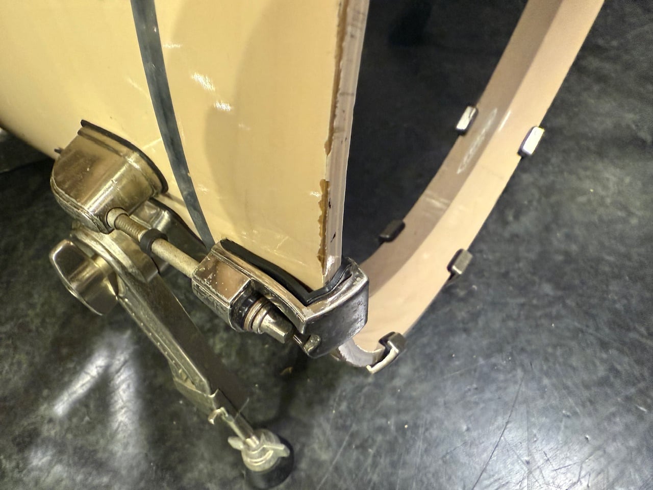 バスドラムのウッドフープのフック全てに、経年による変形が見られます。