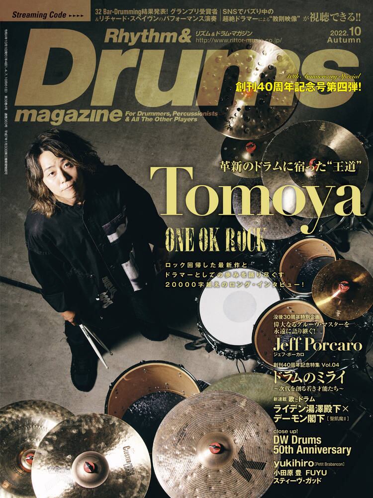 今年デビュー15周年の節目を迎えたONE OK ROCK。今や日本を代表するロック・バンドへと成長した彼らが、アニバーサリー・イヤーに放つ3年ぶりのオリジナル・アルバム『Luxury Disease』は、グリーン・デイやマイ・ケミカル・ロマンスを手がけた重鎮=ロブ・カヴァロのプロデュースによるロック回帰作。バンドの絶対的な核を担うTomoyaのドラムも躍動し、その独創的なスタイルに王道のアプローチを融合させた、新感覚なドラミングを繰り広げている。約5年ぶりに実現した今回のアーティスト特集では、ドラマーとして新たな境地へと辿り着いたTomoyaに、新作についてはもちろん、デビューからの15年の歩みについて、たっぷりと語ってもらった! 22ページに渡る大特集!!