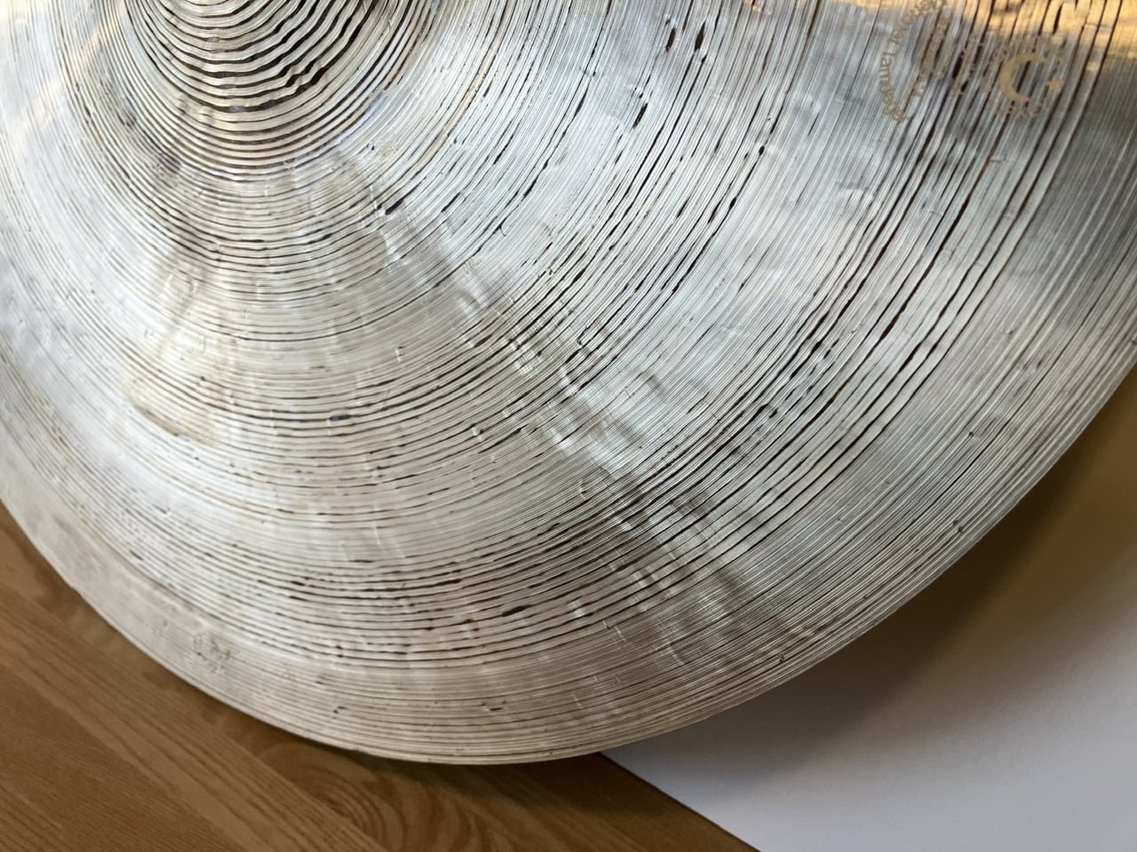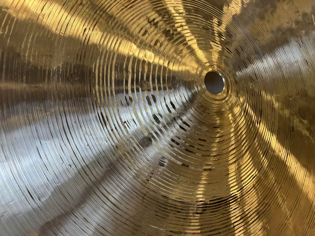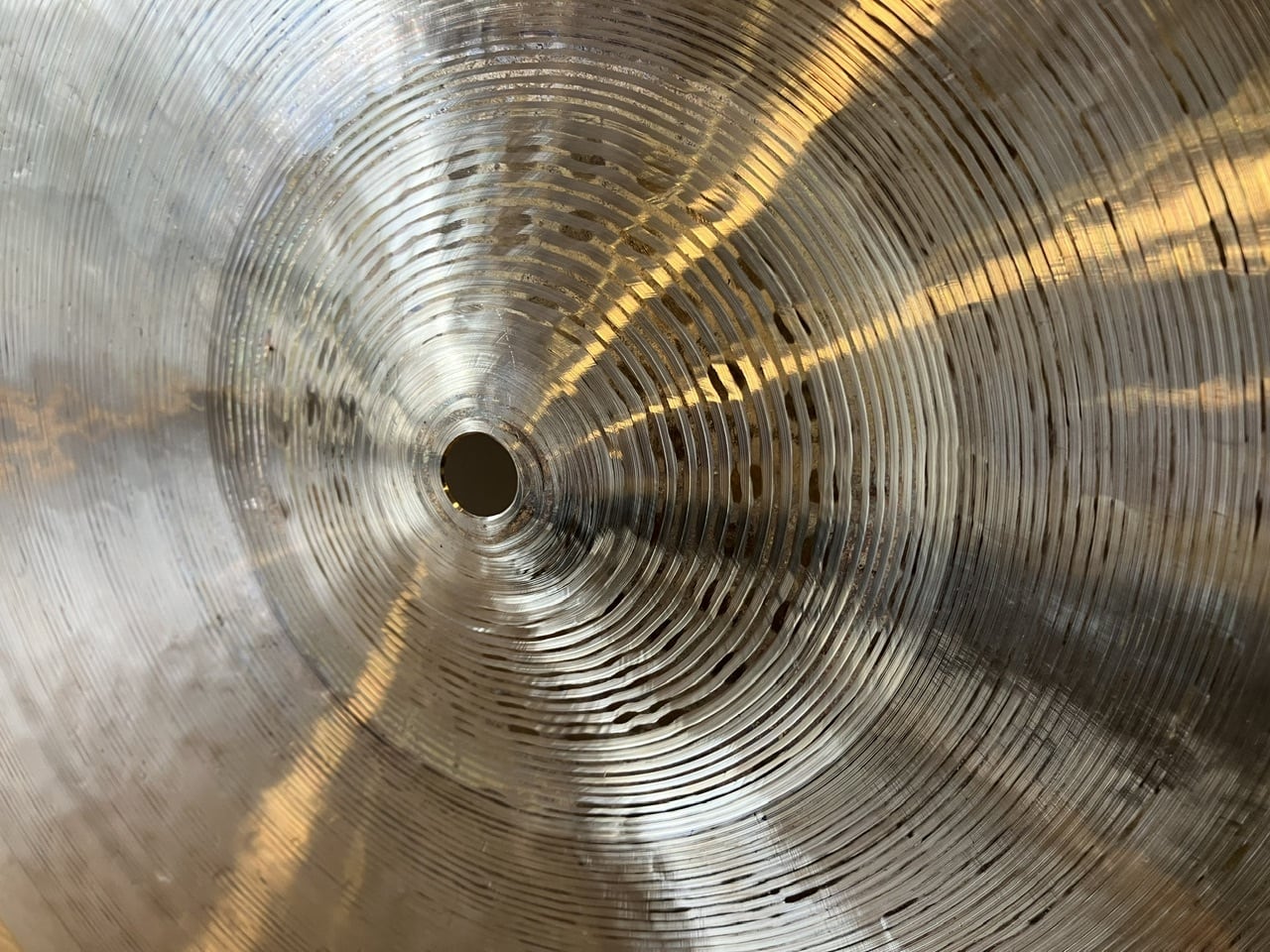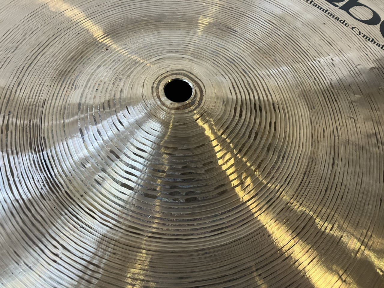 こちらはMEHMET Legend Classic Suspended crash 18"の製品開発の段階で製作された通常とは違う試作品ともいえるバージョンで、カップの部分にレイジングが施されていおり、ハンマリングもされているという特殊な設計になっています。