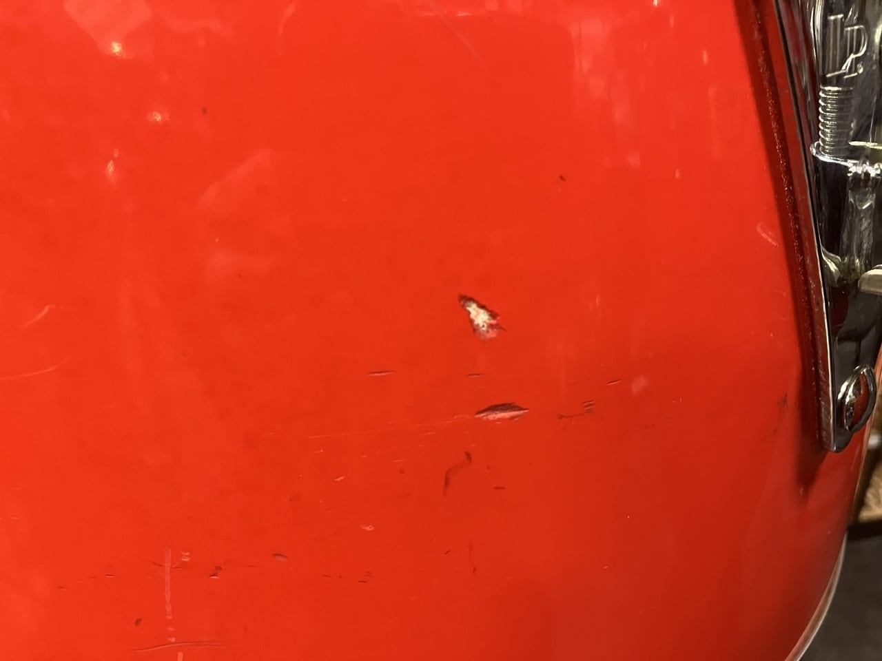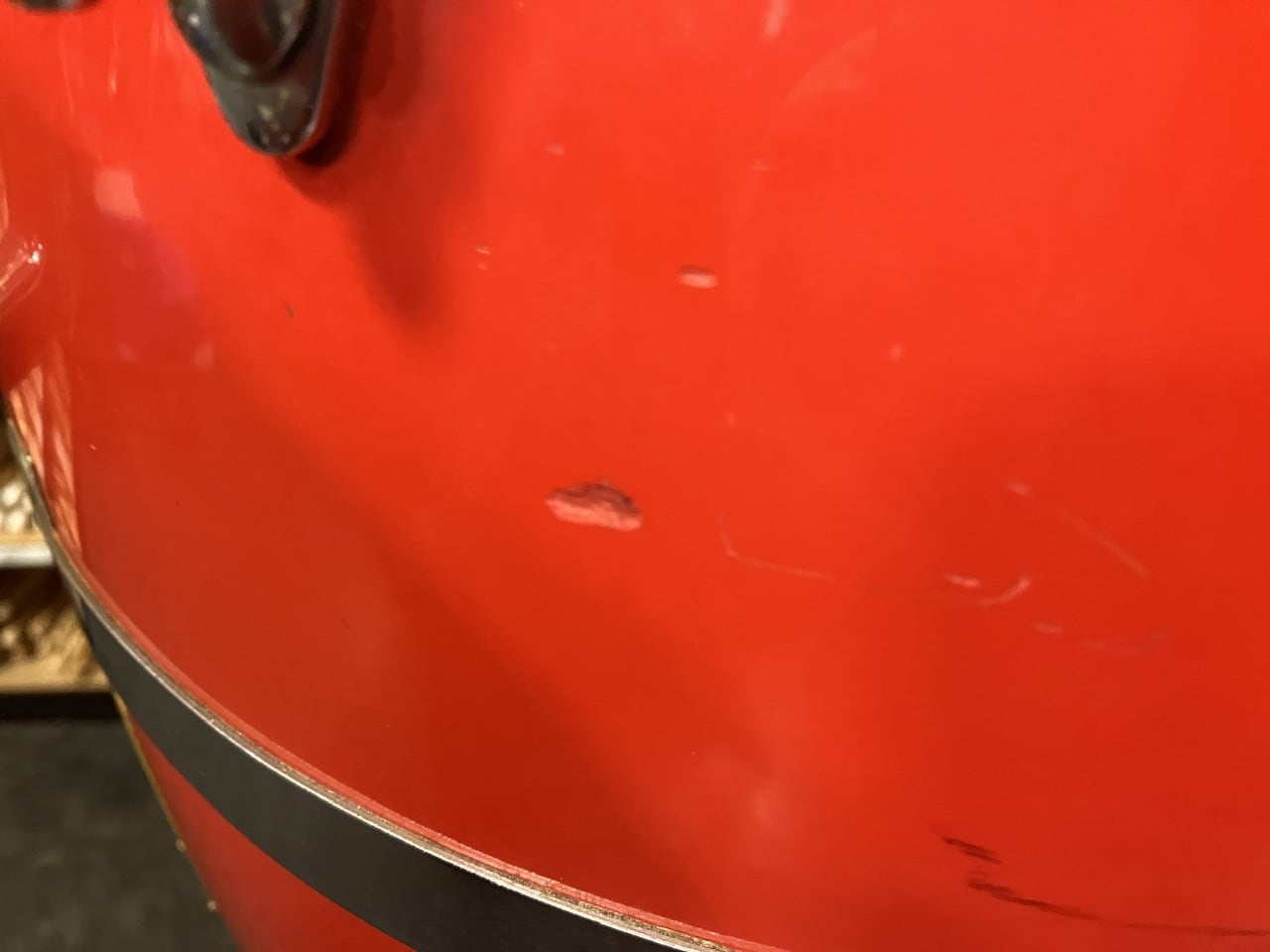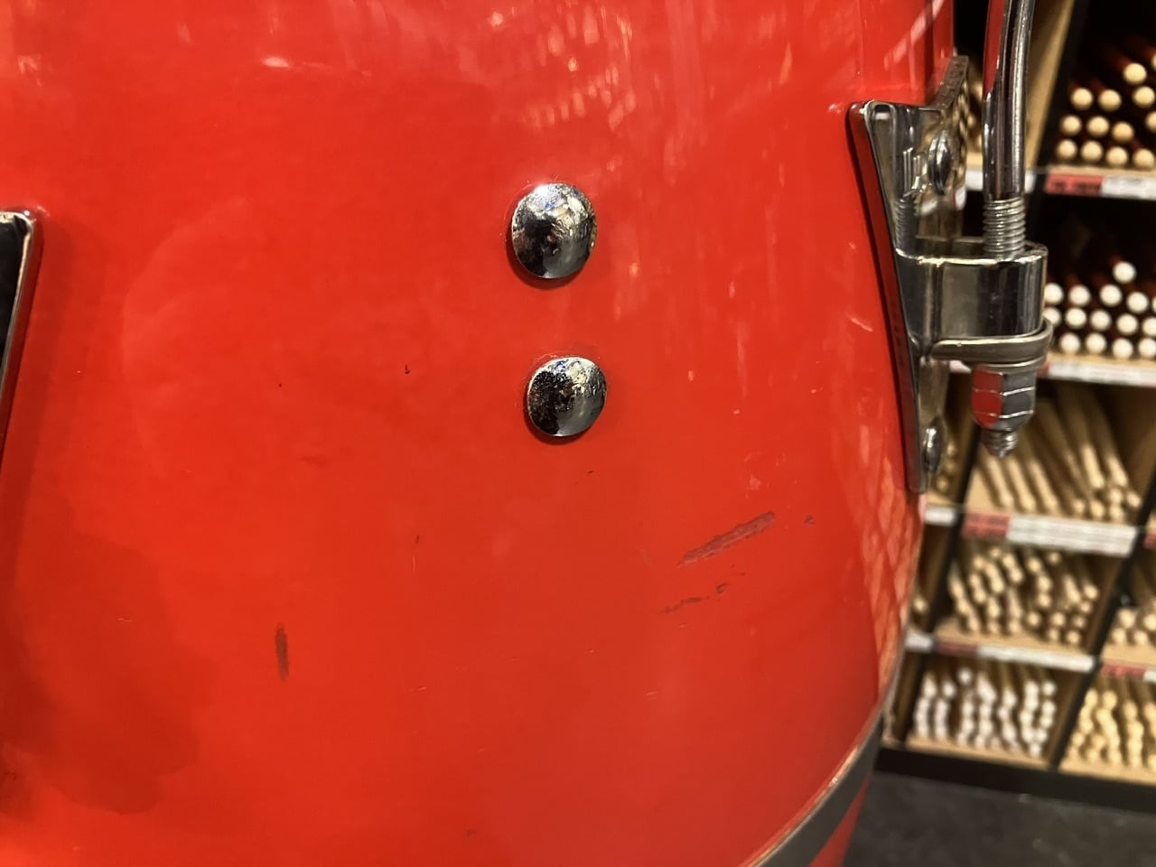 年代相応のパーツのくすみやメッキのキズ、ファイバーグラス シェル外周全体にキズ、多少のボルトのサビ、ヘッドへの小さなキズなどはございますが、全体的にチューニングに影響する大きな歪みや損傷はございません。