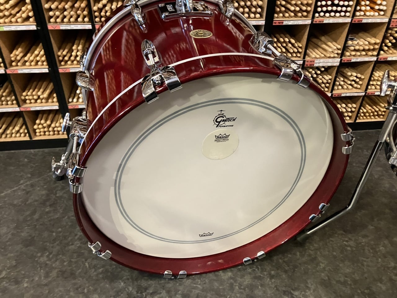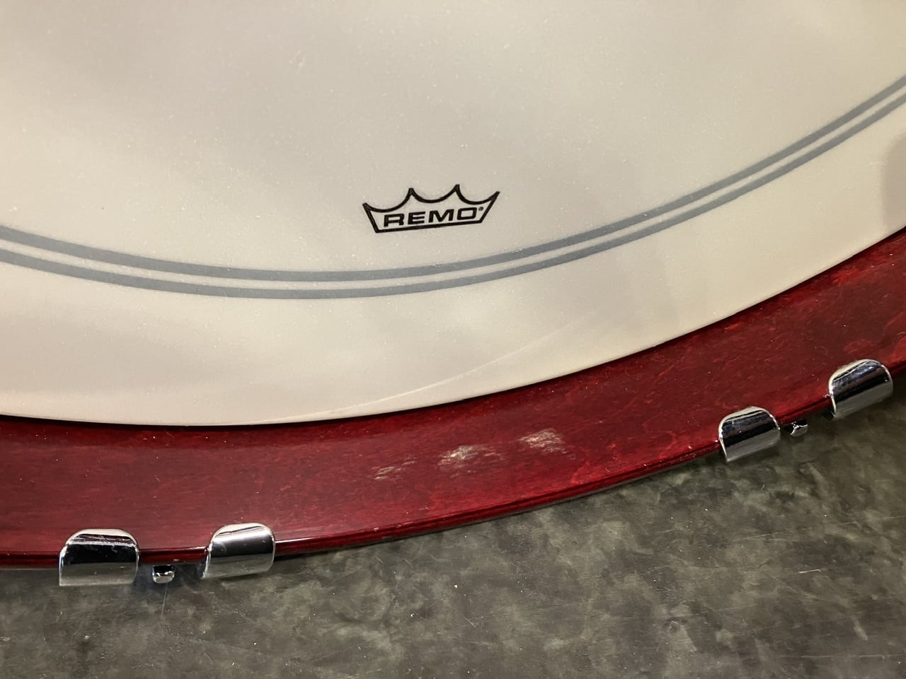 バスドラム : [打面] Gretsch コーテッド パワーストローク3 (純正オリジナル) / [フロント] Gretsch ロゴ入りコーテッド (純正オリジナル)