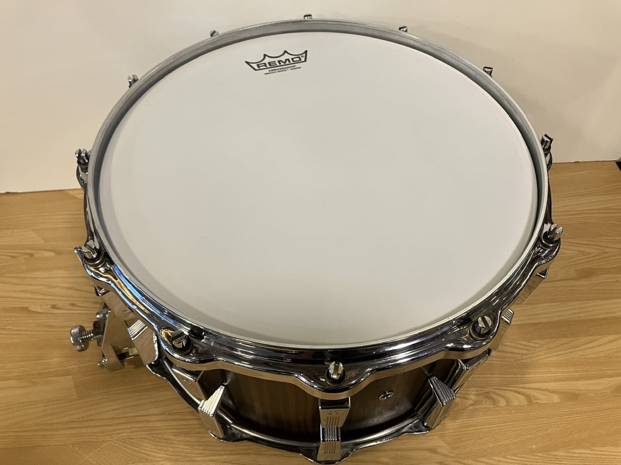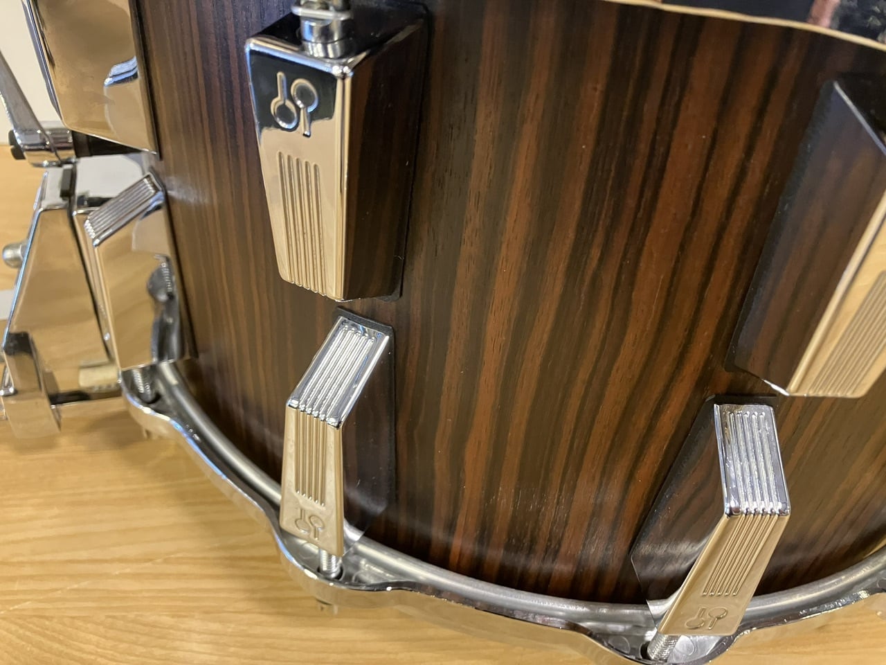 高級感あふれるマッカーサー・エボニーの杢目も存在感抜群の極厚ビーチシェルは、14"×8"という当時のトレンドともいえる超深胴サイズ。