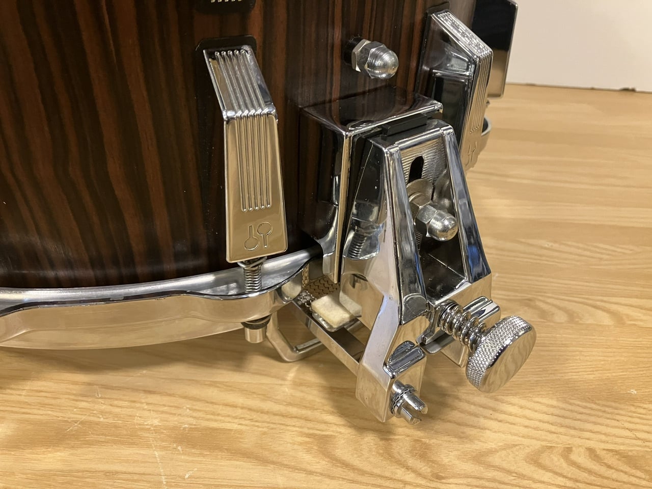 シェルの内部を走るシャフトがスネアワイヤーを固定する左右のパーツを同時に上下させる特殊機構で、超精密なタッチの調整を可能にしますよ。