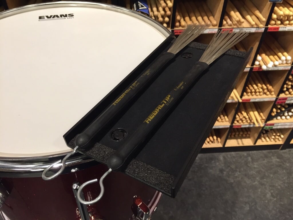 フロアタムなどのフープに引っ掛けて、スティックやブラシ、マレットなどを設置しておける便利な小物台で、スティック持ち替えの多い楽曲で大活躍します。