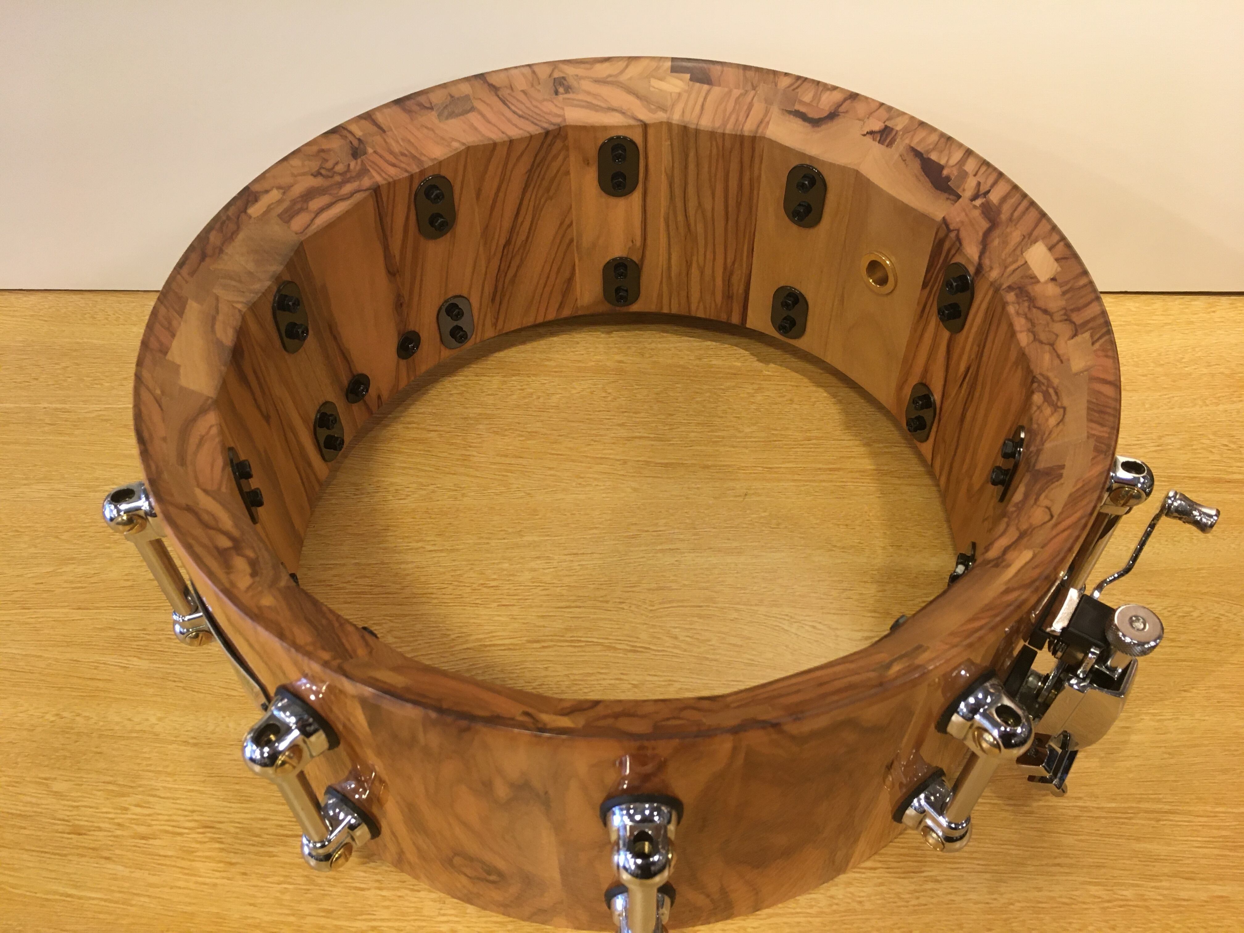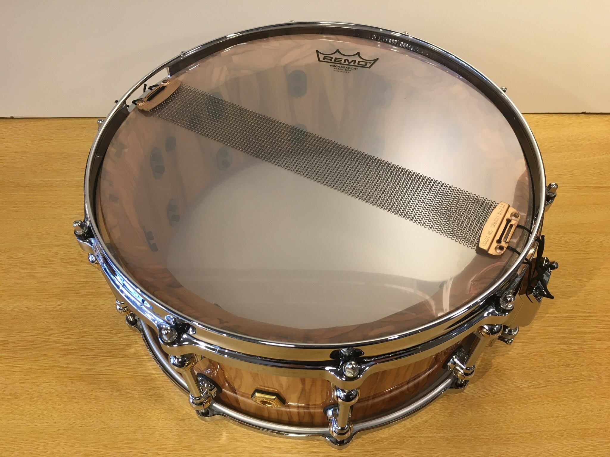 芯が太く圧倒的な音圧を持つ力強いトーン、響きの素直なブロック工法ならではのレスポンスの早さに加え、まとまりの良く品のある響きが特徴で、音楽的に非常にレベルの高いスネアとなっております。