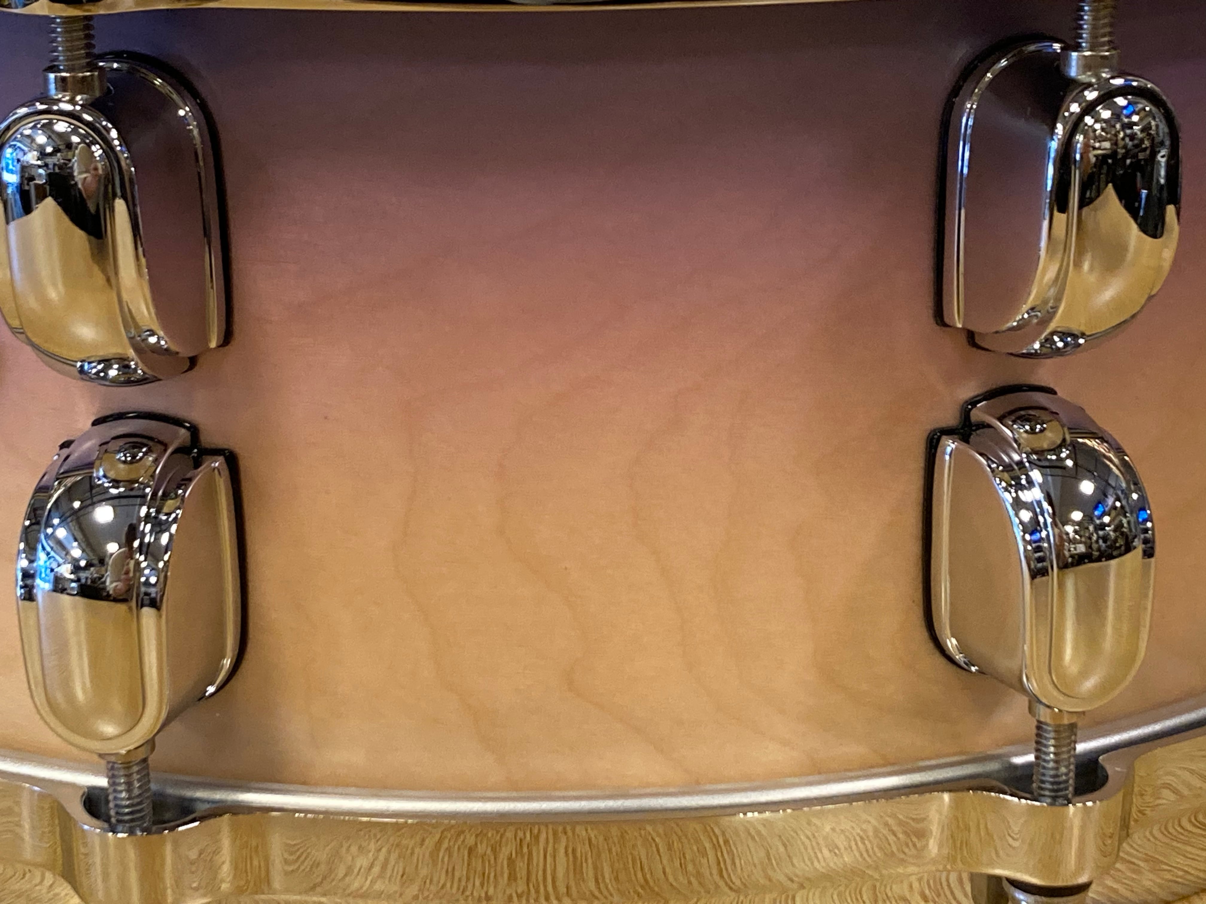 ウォルナット材の締まったシェル鳴りに、バーチ材のパキッとしたアタック感と乾いた鳴りで深い響きと圧倒的な音飛びが混在するスネアになっています。