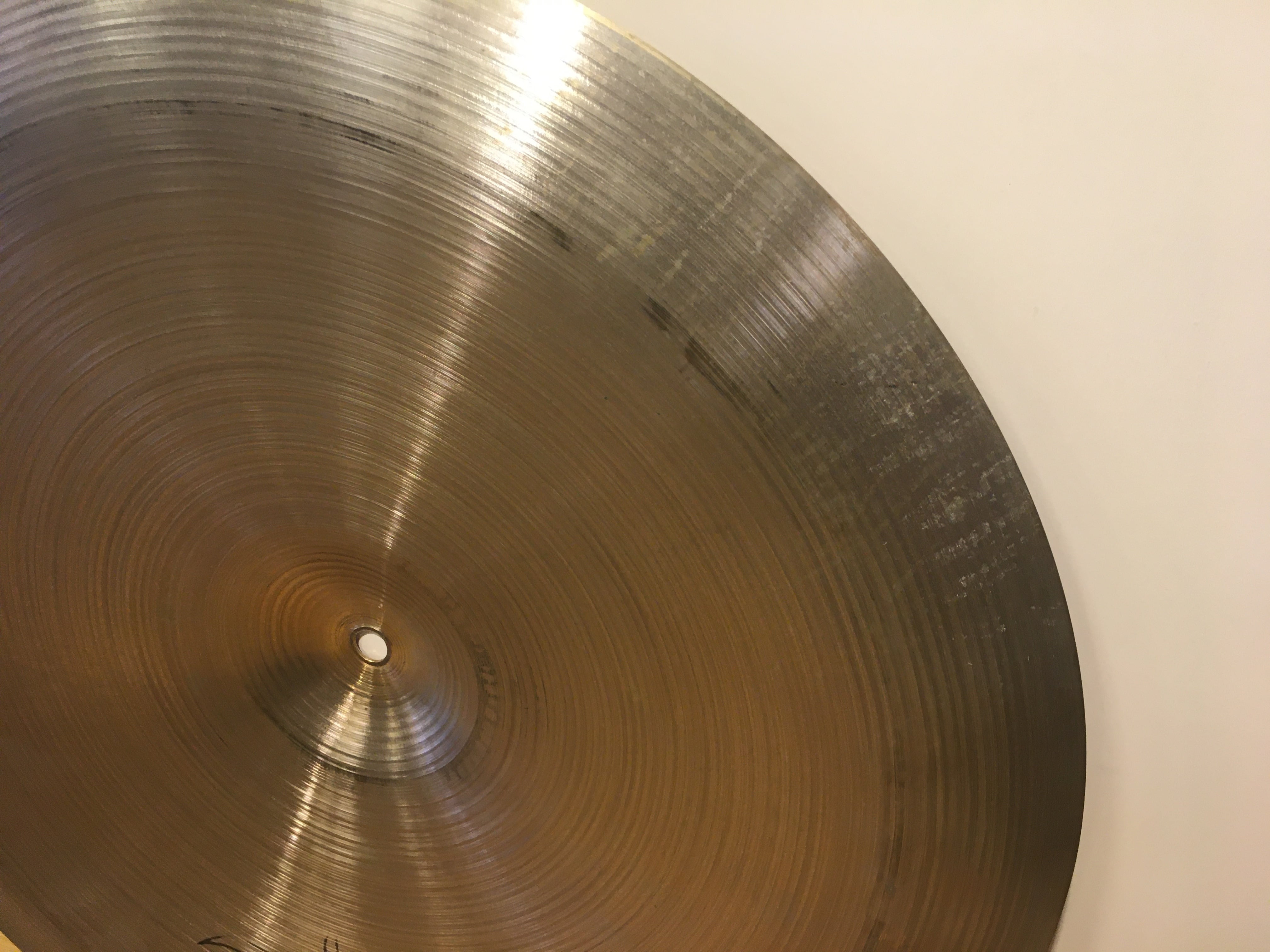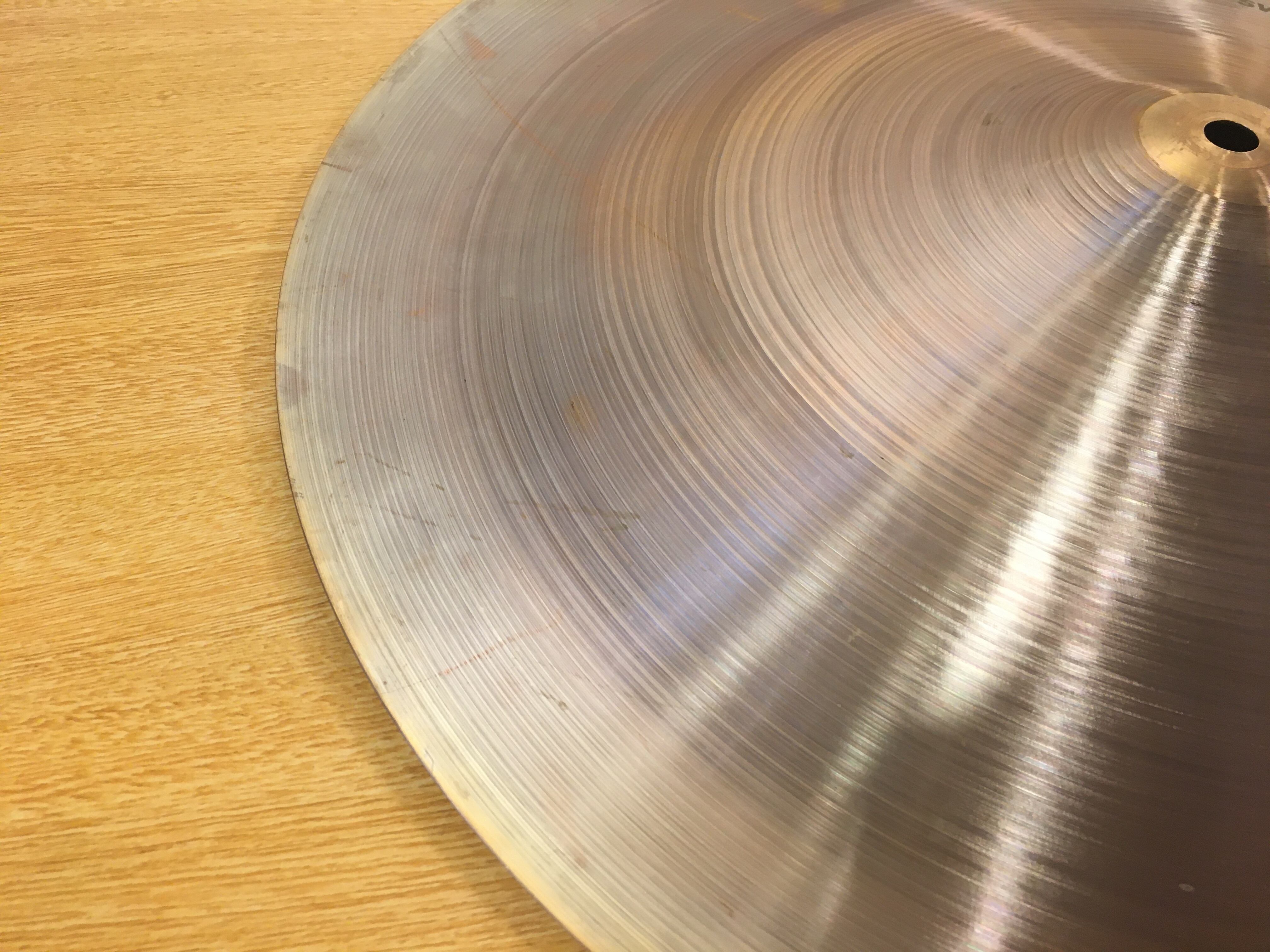 年代相応の汚れなどはありますが、珍しく表面のロゴもハッキリ残っており比較的状態の良いヴィンテージ シンバルです。