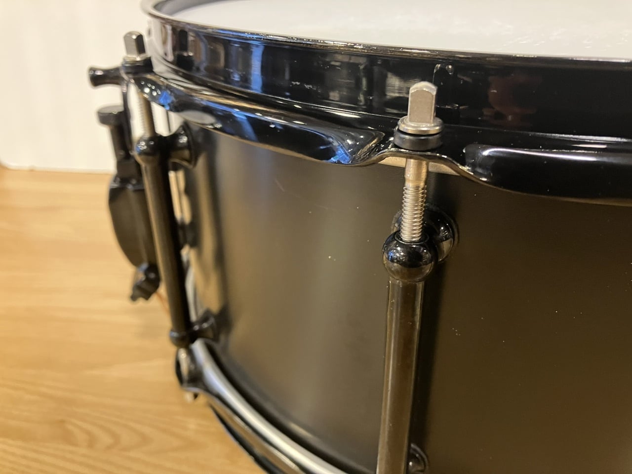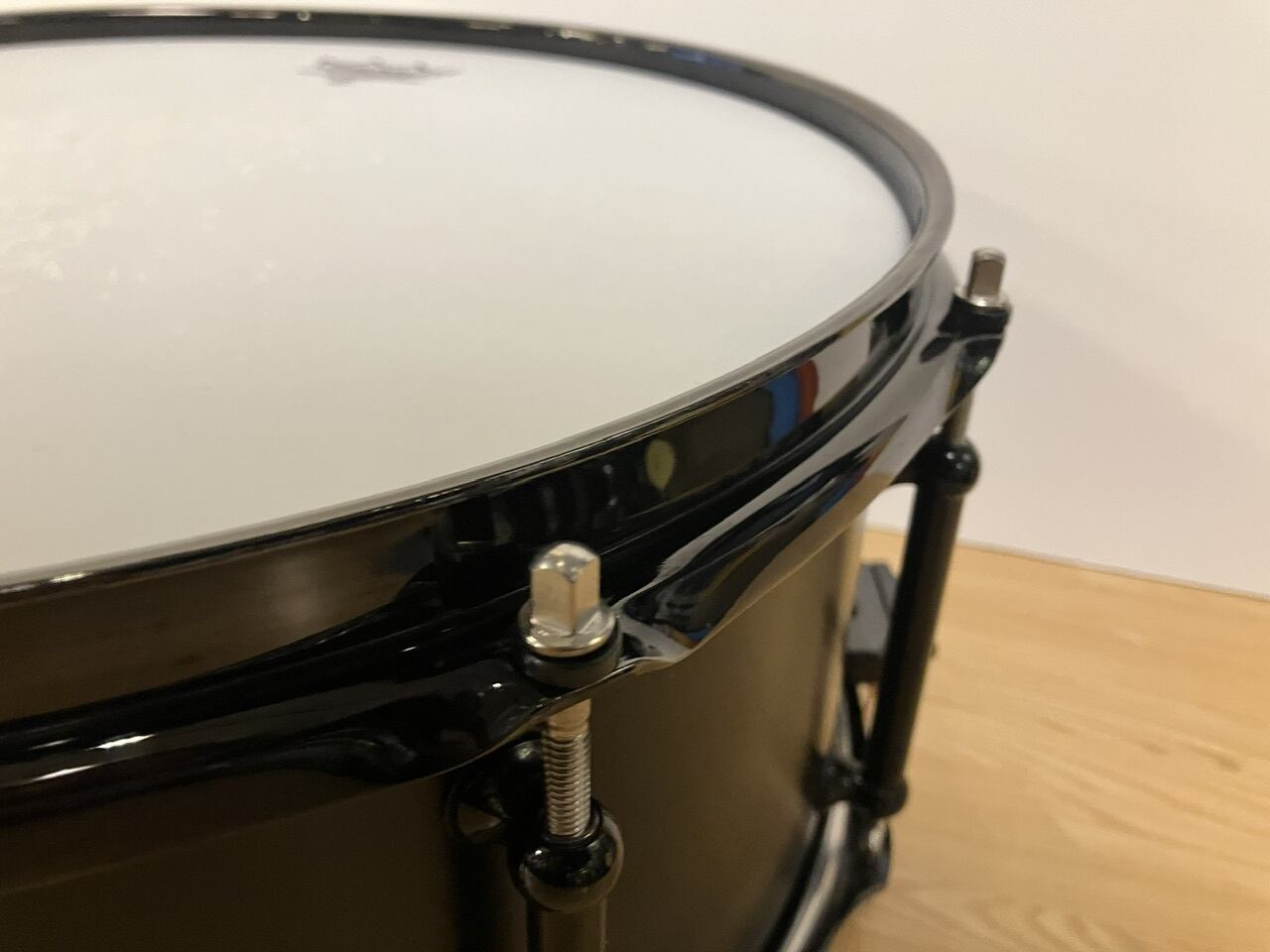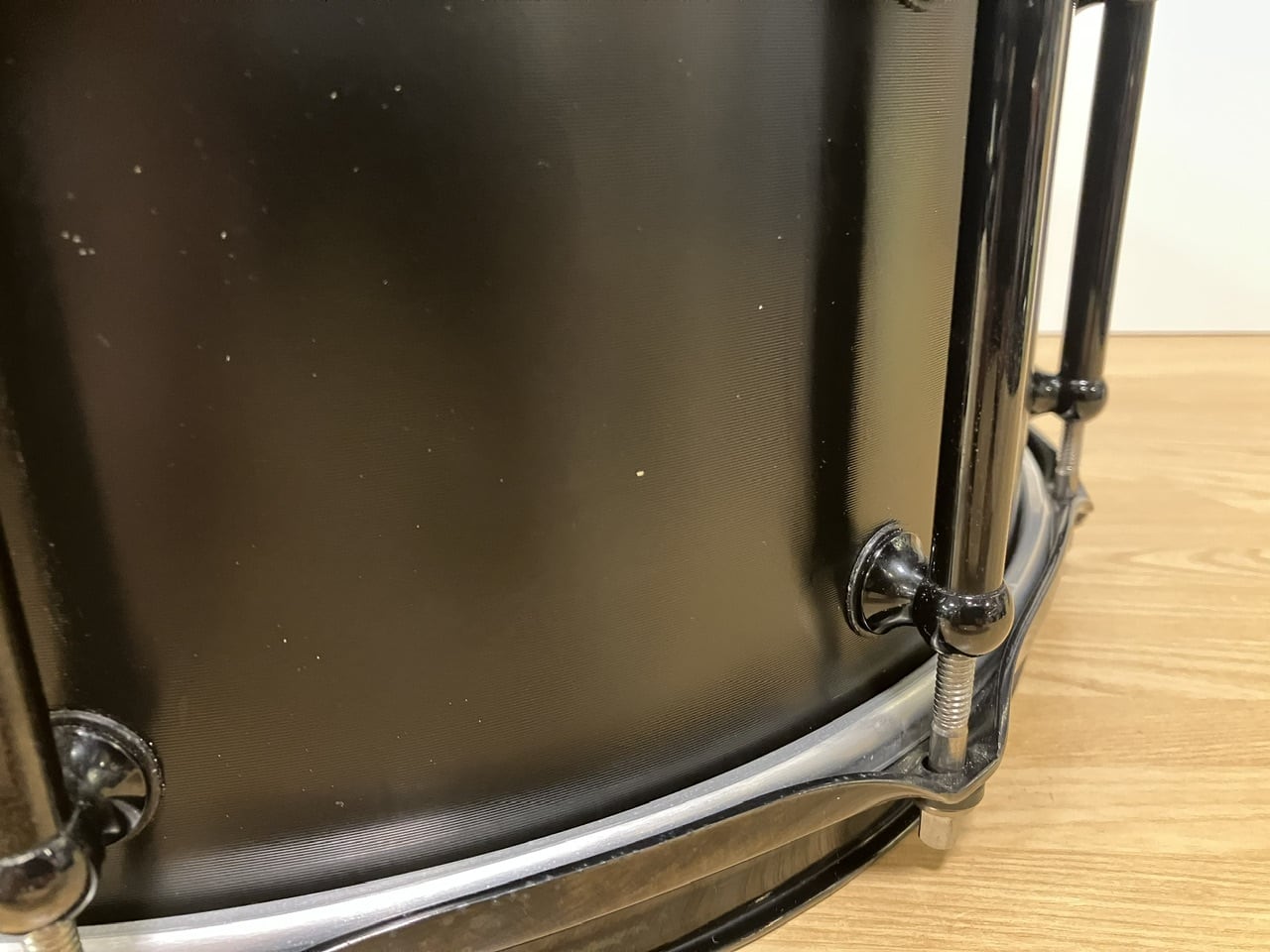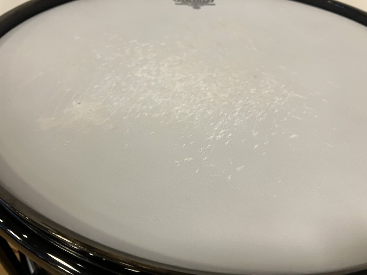 USEDでございますので、パーツの一部やシェル外周にすり傷やブラック塗装の剥がれ、トップ側のエッジに小さいキズ、打面ヘッドに打痕やコーティングの剥がれ等ございますが、シェルやパーツやフープ含め歪み等は無く、演奏に支障はございません。