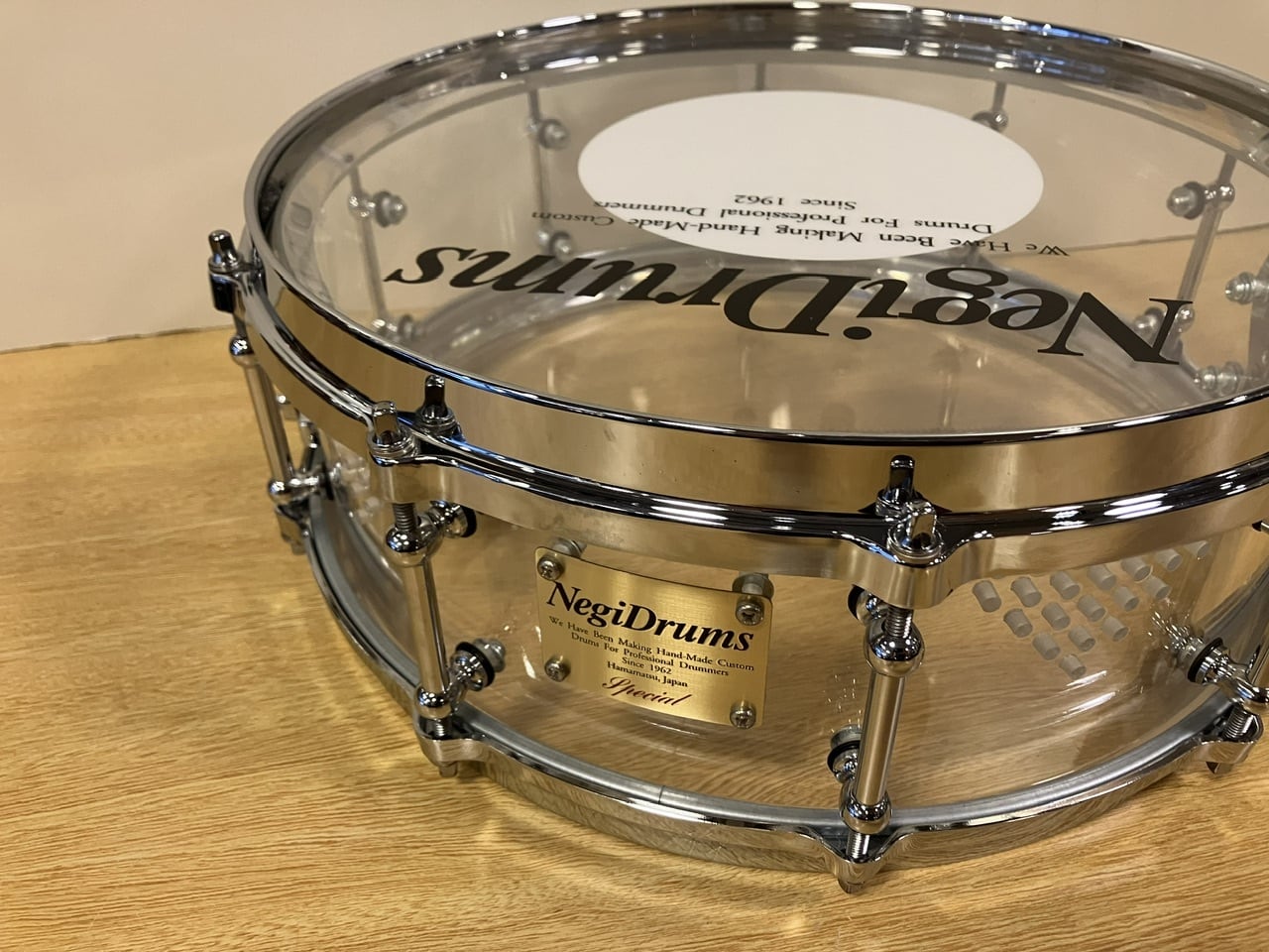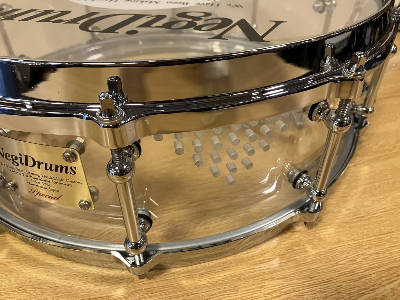 NegiDrumsの中でも特に人気の高い透明のクリア アクリル製シェルのスネアのスペシャル仕様です。